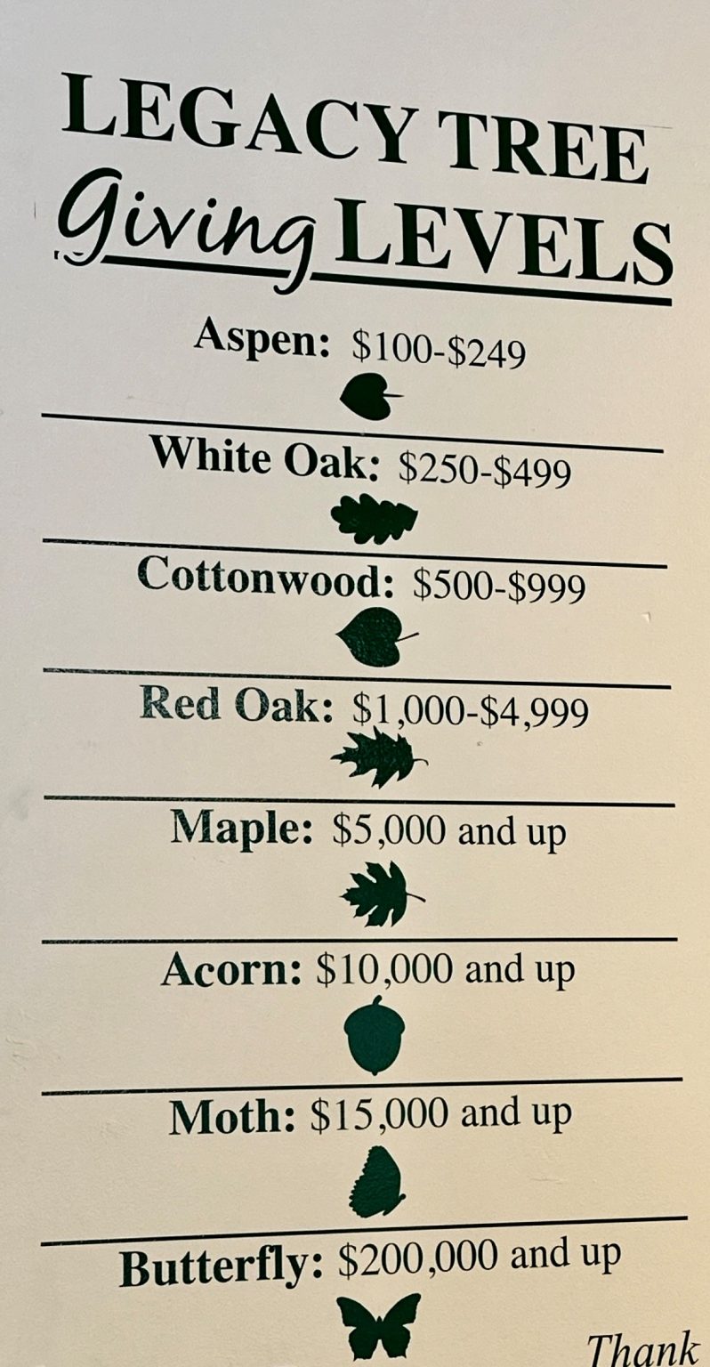 Many people also choose to make a donation in memory of someone special. Memorial donations will be recognized on the Legacy Tree, with specific leaf styles and giving levels currently being finalized.