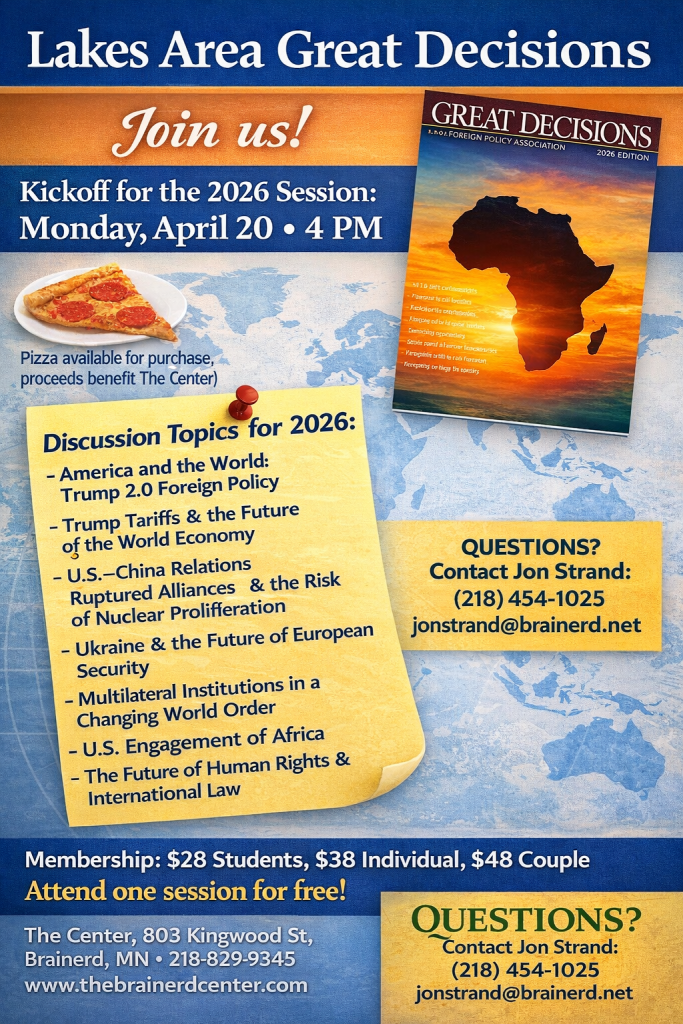 Please make checks payable to The Center, indicate Great Decisions on the bottom of the check, and mail or drop off payment at: The Center, 803 Kingwood Street, Brainerd, MN 56401.